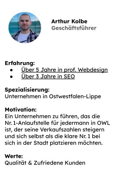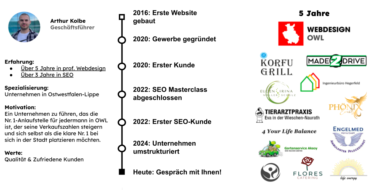 Unser Team Arthur Inhaber Webdesign & SEO Michael Helping Hand Branding Haris Helping Hand Website-Führung Geschichte ¹ Webdesign OWL:Ihr Partner in Ostwestfalen-Lippe für modernes Webdesign, SEO und starke Markenauftritte.